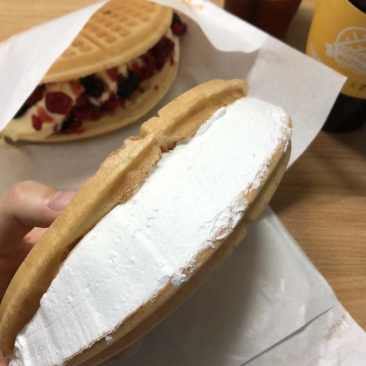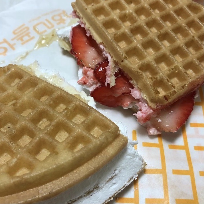 그리고 겨울이니만큼 계절에 맞게 생딸기와 생크림이 듬뿍들어간 생딸기크림와플도 인기가 많습니다.