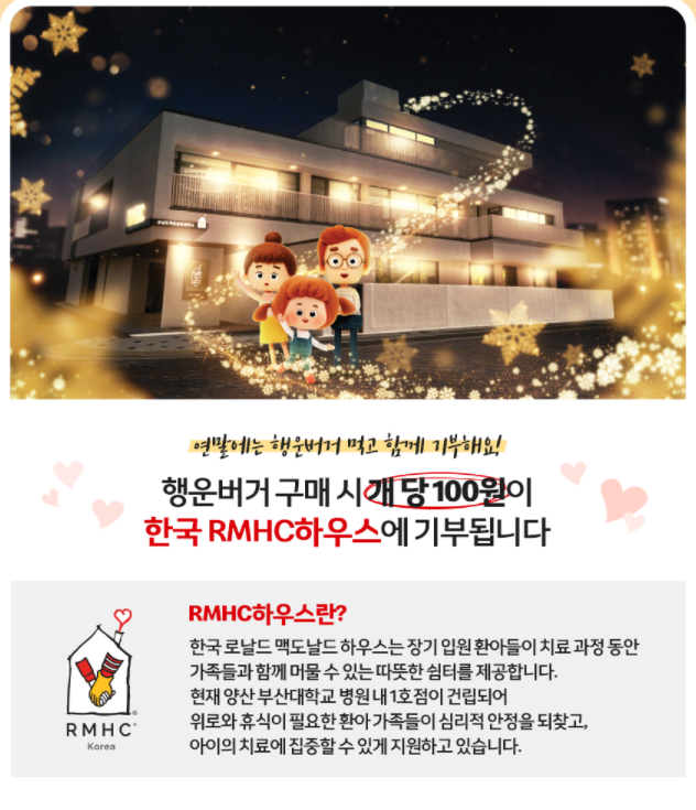 둘째, 버거 구매 시 개당 100원이 장기 입원 환아들을 돕는 데 기부되어 뜻깊은 활동에 동참할 수 있어요.