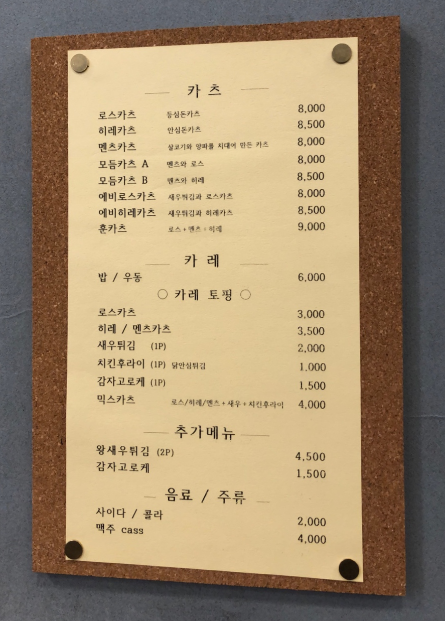 메뉴는 크게 카츠와 카레로 양분되어 있고, 카레는 밥과 우동을 기본 옵션으로 선택하실 수 있습니다.