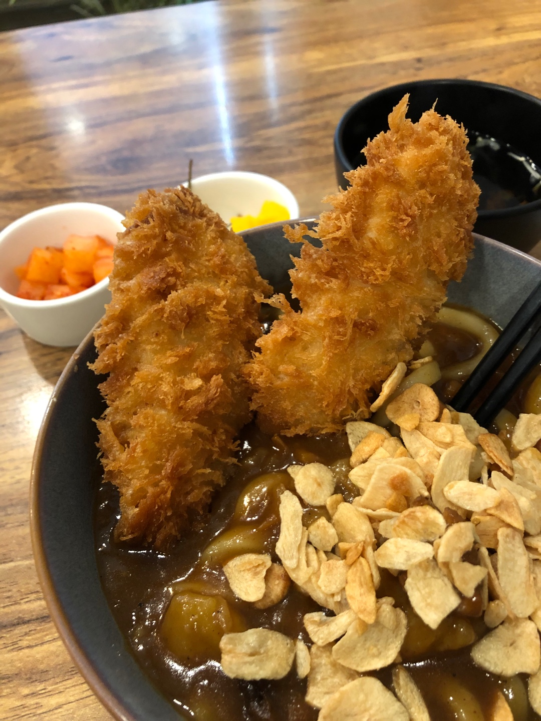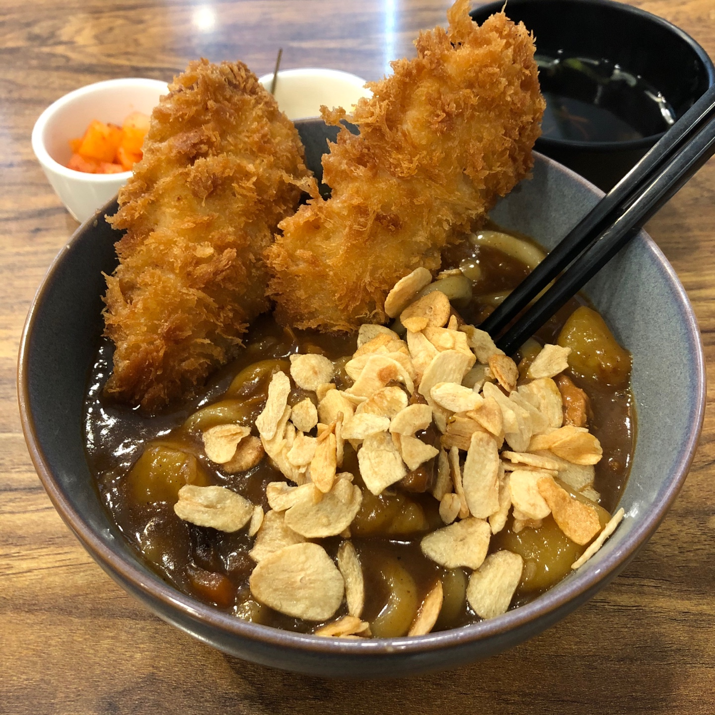 기본으로 제공되는 고소한 마늘 후레이크+뜨끈한 고퀄리티 카레+탱탱한 우동면+갓 튀긴 닭안심튀김의 조합.....