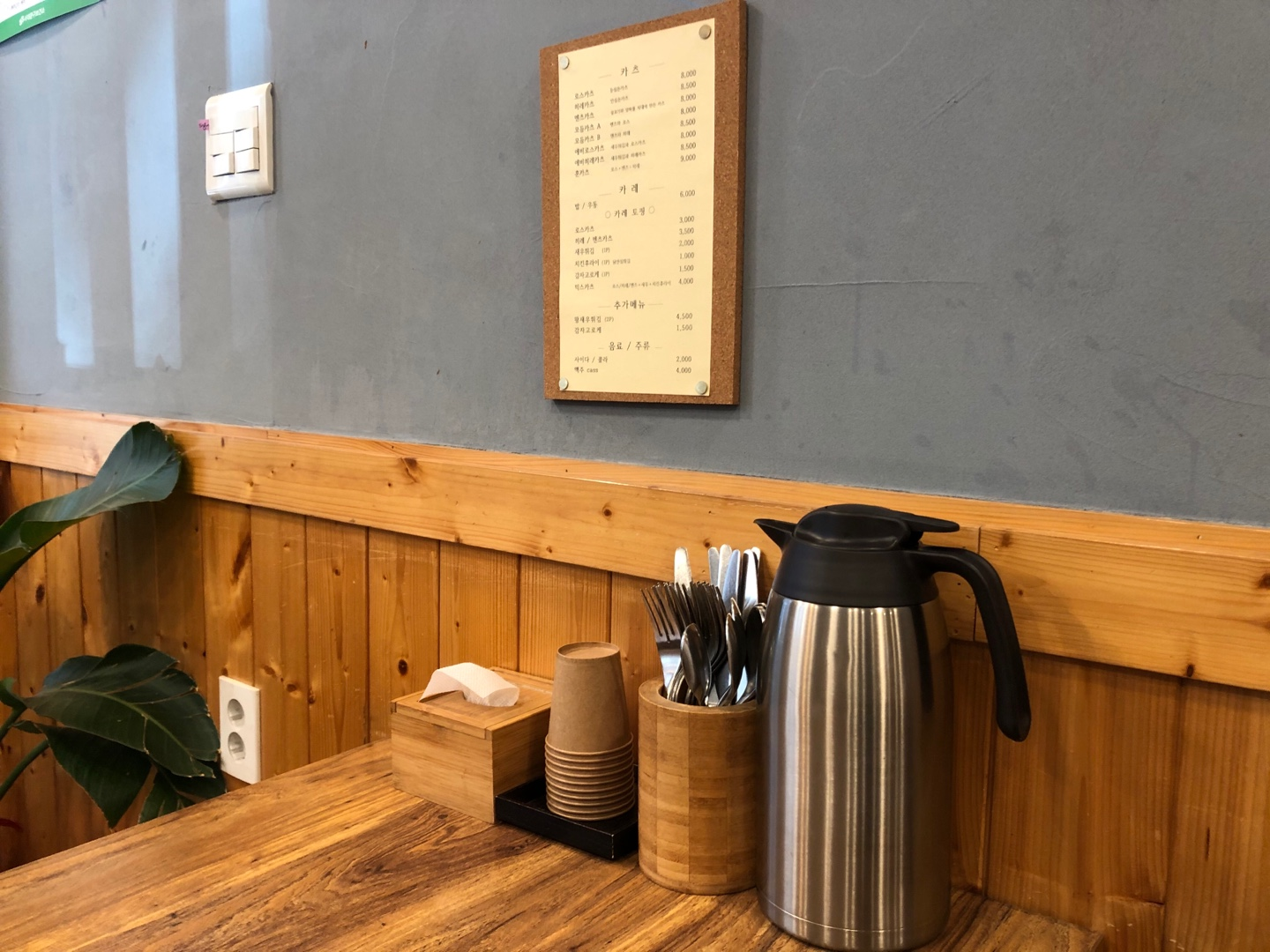벽지와 어울리는 우드톤으로 가구를 맞추셔서 가게 전반 분위기가 깔끔하고 화사하게 느껴졌어요.